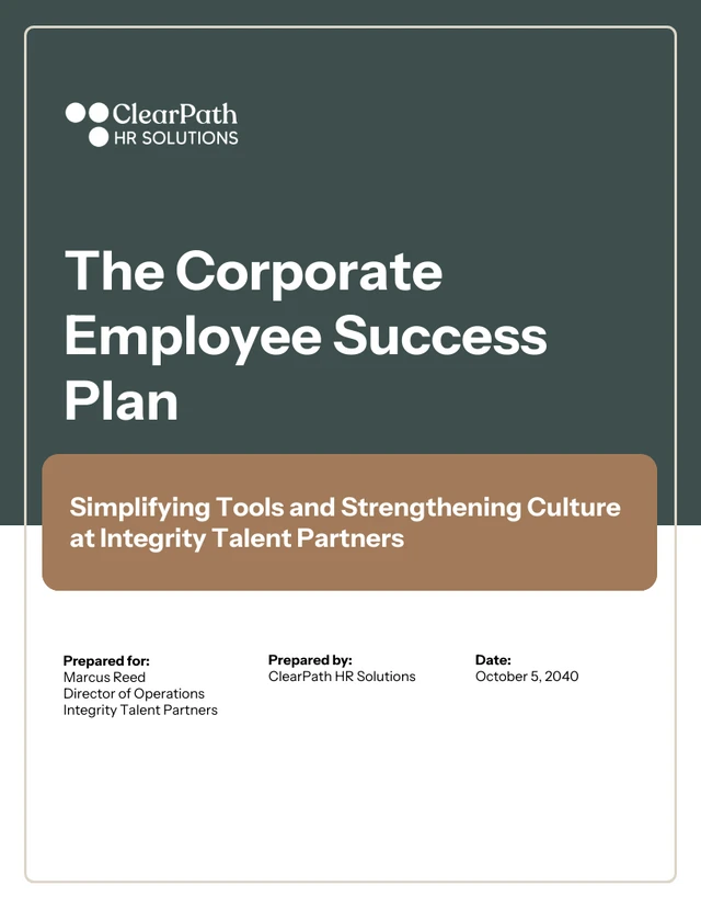 Il modello di proposta per un piano di successo aziendale per i dipendenti è stato creato per aiutare le aziende a presentare le proprie strategie per promuovere la crescita e il successo dei dipendenti in modo chiaro e convincente. È perfetto per i team delle risorse umane o i manager che desiderano delineare piani di sviluppo, indicatori di performance e sistemi di ricompensa. Il layout professionale e semplificato garantisce che la tua proposta sia facile da consultare e visivamente accattivante. Questo modello è il design ideale per promuovere e far circolare il messaggio! Personalizzalo come preferisci: modifica i colori per adattarli al branding della tua azienda, adatta le dimensioni a diversi formati di presentazione e scegli le foto o le icone migliori dalle nostre librerie gratuite per far risaltare il tuo messaggio. Con Venngage, progettare la tua proposta aziendale ideale non è mai stato così facile e flessibile, permettendoti di concentrarti su ciò che conta di più.